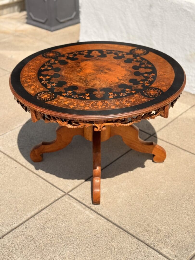 Beautiful Antique Dutch center table, showcasing beautiful marquetry inlay and fine hand-carved detailing. The circular top is richly decorated with intricate inlaid patterns-featuring scrolling foliage, florals, and geometric motifs-contrasted against darker banding that frames the composition and enhances its visual depth. The warm tones of the burl walnut and other fine veneers, create a striking…