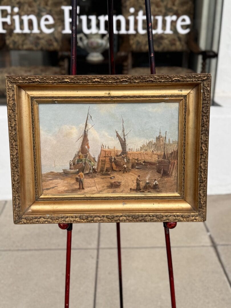 A charming antique maritime scene circa 1880. The composition depicts a lively dockside with sailing vessels hauled ashore, as figures work and gather-capturing the movement and character of a 19th-century working harbor. While not tied to a specific location, the scene is likely inspired by a European coastal port, reflecting the romantic maritime tradition of the period where artists portrayed atmospheric, idealized harbor life rather than exact places.