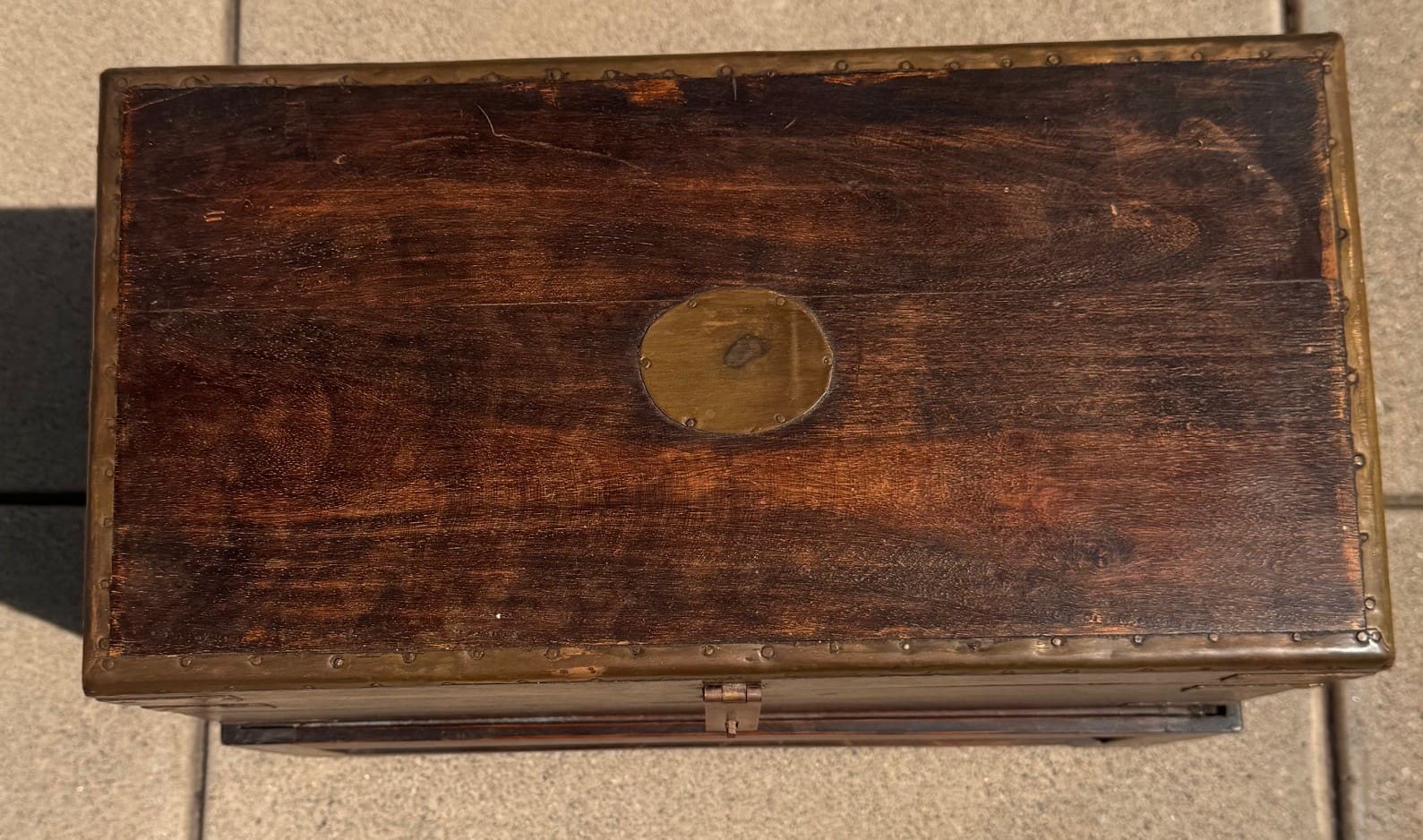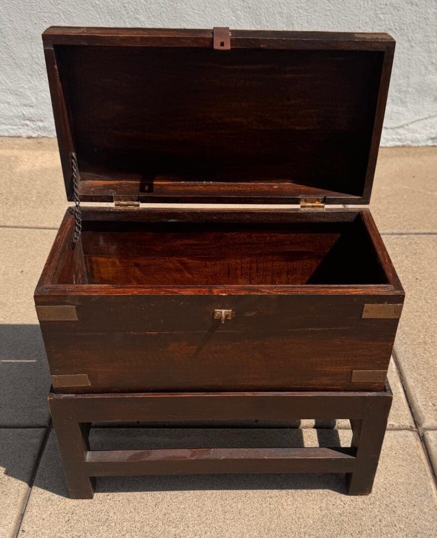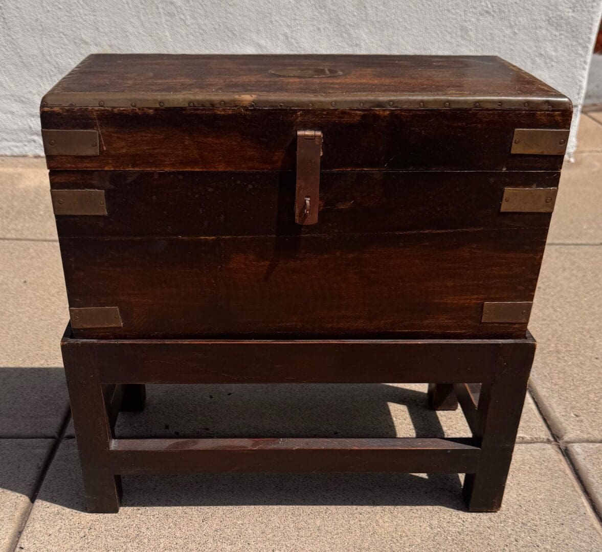 A charming and characterful antique English wooden chest, showcasing simple craftsmanship enhanced by understated brass detailing. Constructed from richly toned wood with a beautifully aged patina, the chest features a clean, rectangular form elevated on a sturdy integrated stand with stretcher support, giving it both presence and practicality. The lid is secured with a traditional clasp, while the corners and edges are reinforced with brass mounts and riveted straps, adding both durability and subtle decorative interest.