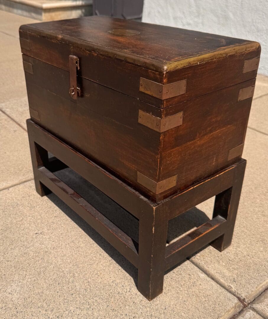 Charming Antique English chest with brass detailing on wooden stand