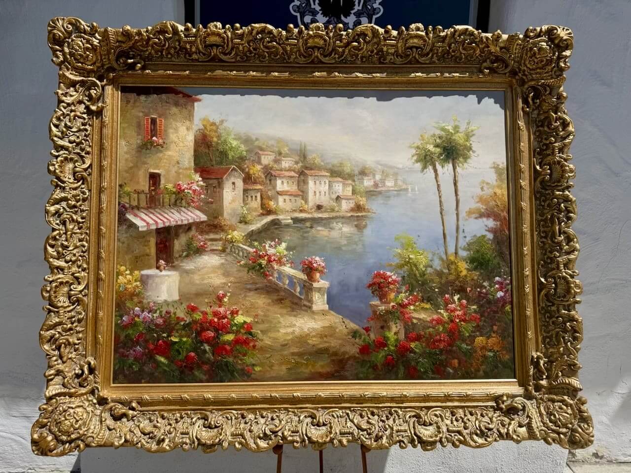 This beautiful Painting depicts a sunlit Italian Riviera terrace. The composition draws you in along a charming terrace lined with vibrant florals, overlooking calm blue waters and a cluster of warm-toned village homes nestled into the hillside. Soft, impressionistic brushwork and a glowing palette of reds, ochres, and blues create a romantic, tranquil atmosphere.