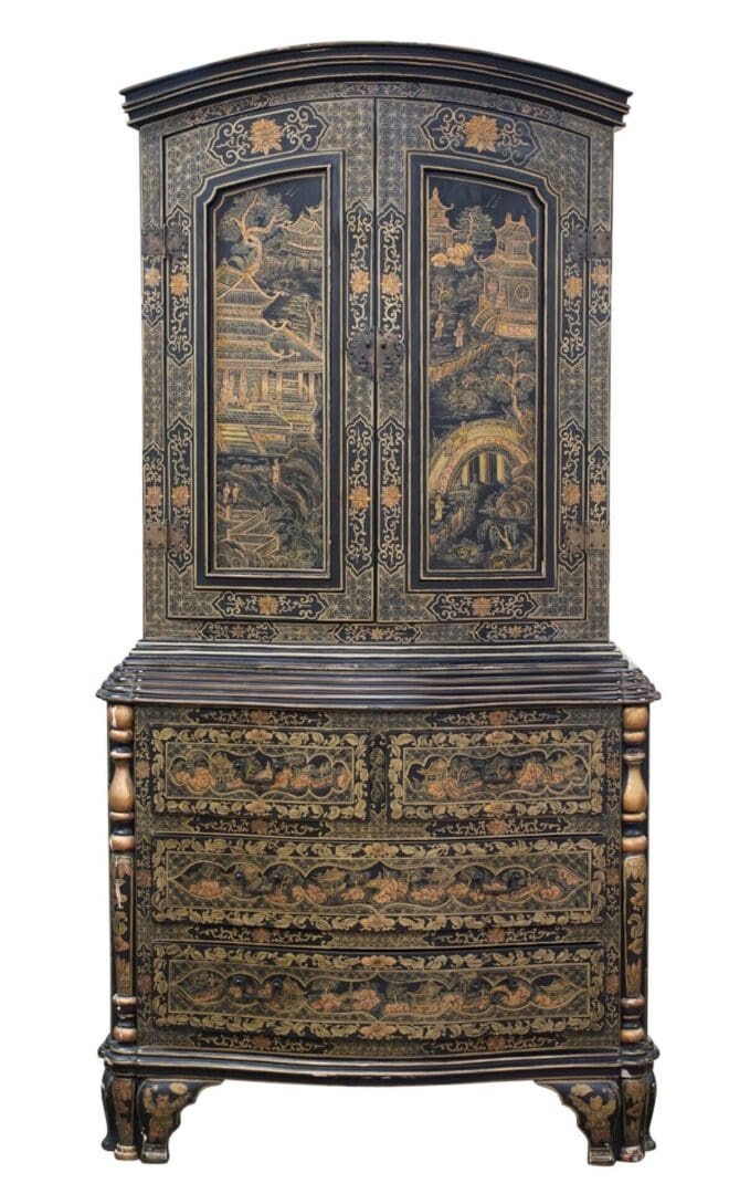 This Tall Chinese Lacquered Cabinet is from China, late Qing Dynasty circa 1900. It is Lacquered wood with gilt decoration and finished in deep black lacquer and richly embellished with hand-painted gilt decoration. The upper doors are adorned with architectural landscapes, pagodas, bridges, rivers, and figures all set within elegant panel borders, a traditional motif symbolizing harmony, prosperity, and scholarly life. The lower section features graduated drawers decorated with continuous scenic and floral scrollwork, creating a balanced and visually unified composition.