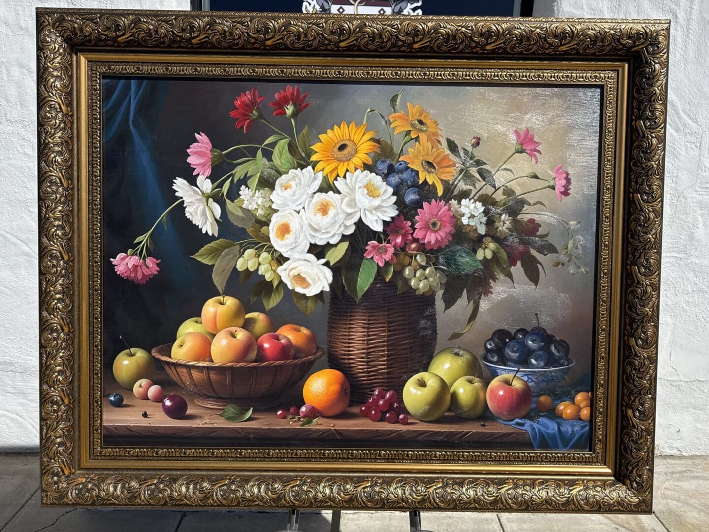 A beautifully executed still life in the Dutch tradition, this contemporary oil on canvas captures the richness and precision of 17th-century European painting. A vibrant arrangement of flowers and fruit-grapes, apples, citrus, and blossoms all spill across the composition, rendered with remarkable detail, depth, and luminosity.